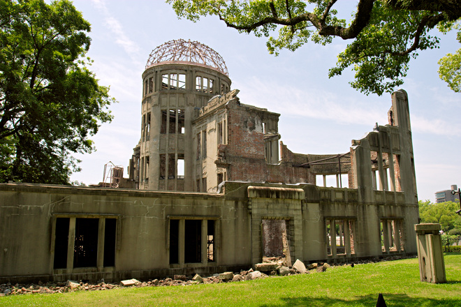 Iconische overblijfselen van een tentoonstellingsgebouw dat tijdens WOII is vernietigd door de atoombom in Hiroshima.